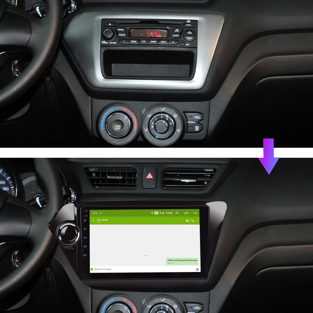 EKIY 9'' 2.5D Android Car Multimedia Player No 2 Din Auto Radio Stereo For Kia K2 Rio 2010-2017 GPS Navigation With 4G Modem Feature: System:Android Operation System RAM:1/2G ROM:16/32G Touch Screen:9inch IPS Screen Resolution:1024*600 Function: DIY wallpaper from Gallery Pictures OSD Language:it has more than 70 kinds of languages to select Built-in WiFi Modem, Include 4G Modem,Support 4G/Mobile Phone WIFI hotspots. DIY Main Menu Display: You can drag Search Bar, Weather Forecast widgets, Music/Radio/BT-Stereo Player,Apps or other Bookmarks on main menu to display Built-in Mirror link. It can connect with Iphone via Wifi hotspots and connect with Android mobile phone via USB data cable and Wifi Hotspot. The mobile phone image will display on DVD, also music, video, game. For Android mobile, the DVD touch screen can control the mobile.(Please note: It can support a part of Android mobile not all of them) Support Google Maps online Navigating, Support various Android navigation software including Sygic/IGO 8, and etc Support Android Multimedia Player, it can play Music/Movie/Photo from local Disc or connected TF Card. Online Entertainment, support online video, TV, movie, music, radio, Youtube, Yahoo, MSN... Online Communication, keep connected through WeChat, Twitter, Facebook, Gtalk, Gmail and other services Support read and edit Official Software, WORD/EXCEL/POWERPOINT/PDF/TXT. Support Google Play Store, you can download thousands of Apps from here and you can down many popular games like Fruit Ninja, Feed the Candy, Angry Birds, Fieldrunner, speed forge 3D... Support Games app, HD Video, 1080P, H.264, DIVX Live images Formats Support Bluetooth hands-free function, built-in microphone Download phone book function, you can download contact information from your phone to this unit Support the newest Phone Book Search, you can search&find a contact member in downloaded phone book,just input the first letter of name, you will find some associated names, then you can choose the right one. Support Car DVR System, just connect with a USB Camera to use Car Record function. the records will be saved in GPS card automatically, and you can play saved record on this unit directly. Support DVB-T T2/MPEG2/MPEG4/ISDB-T Box input (TV box isn't included) Support Steering Wheel Control, With this function, you can intently focus on the driving and choose your favorite music safely on the move. (This function can only work with the car which supports analog signal) Support OBD Turque Function. you can connect OBD Dongle(Not included). Combined with vehicle detection software that can read car each sensor date, real-time detection auto state, providing real-time valid reference data for traffic safety. Support Europe Digital Audio Broadcasting(DAB), you have to buy a USB receiver and antenna from us. Only work in Europe area Packing List: Car Radio*1 Frame Adapter*1 Power Cable*1 Reverse Cable*1 RCA Cable*1 GPS Antenna*1 4G Modem*1 4G Antenna*1 USB Cable*2